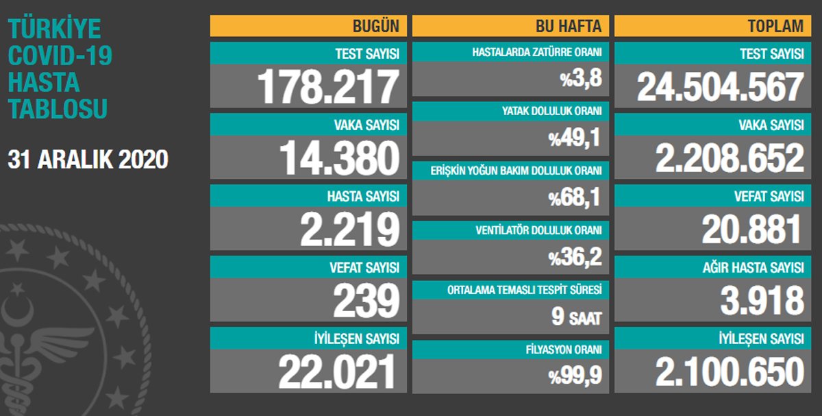 Sağlık Bakanlığı, Türkiye’nin COVID-19 hasta tablosunu açıkladı. 31 Aralık Perşembe gününün verilerine göre Son 24 saatte yapılan 178 bin 217 testle birlikte toplam test sayısı 24 milyon 504 bin 567’ye ulaştı.239 KİŞİ YAŞAMINI YİTİRDİBugün semptom gösteren 2 bin 219 hastayla birlikte 14 bin 380 yeni vaka tespit edildi, toplam vaka sayısı 2 milyon 208 bin 652’ye çıktı. Can kaybı da 239 artarak 20 bin 881’e yükseldi.3 BİN 918 AĞIR HASTA VARGüncel tabloya göre 22 bin 21 kişinin daha sağlığına kavuşmasıyla toplam iyileşen sayısı 2 milyon 100 bin 650’ye çıktı. Öte yandan hastalardaki zatürre oranı yüzde 3.8, ağır hasta sayısı da 3 bin 918 oldu.YOĞUN BAKIMLARIN YÜZDE 68.1’İ DOLUSağlık Bakanlığı’nın günlük olarak açıkladığı hasta tablosunda hastanelerin doluluk oranlarıyla ilgili son bilgiler de yer alıyor. Buna göre yatak doluluk oranı yüzde 49.1, erişkin yoğun bakım doluluk oranı yüzde 68.1 ve ventilatör doluluk oranı yüzde 36.2 oldu.