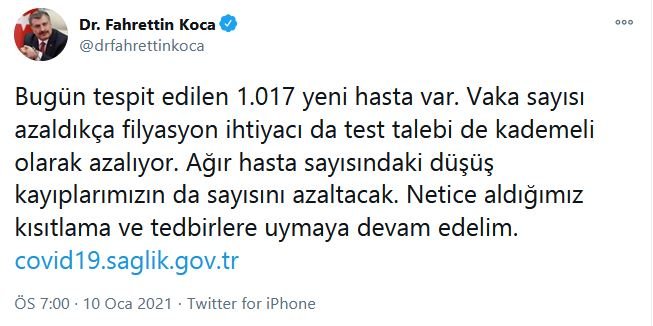 “AĞIR HASTA SAYISINDAKİ DÜŞÜŞ KAYIPLARIMIZI AZALTACAK”Güncel verilere ilişkin sosyal medya hesabından açıklamalarda bulunan Sağlık Bakanı Fahrettin Koca şu ifadeleri kullandı:* Bugün tespit edilen 1.017 yeni hasta var. Vaka sayısı azaldıkça filyasyon ihtiyacı da test talebi de kademeli olarak azalıyor.* Ağır hasta sayısındaki düşüş kayıplarımızın da sayısını azaltacak. Netice aldığımız kısıtlama ve tedbirlere uymaya devam edelim.