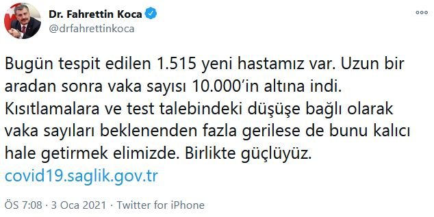 SAĞLIK BAKANI KOCA: VAKA SAYISI 10.000’İN ALTINA İNDİSosyal medya hesabından güncel verilere ilişkin açıklamalarda bulunan Sağlık Bakanı Fahrettin Koca şu ifadeleri kullandı:* Bugün tespit edilen 1.515 yeni hastamız var. Uzun bir aradan sonra vaka sayısı 10.000'in altına indi.* Kısıtlamalara ve test talebindeki düşüşe bağlı olarak vaka sayıları beklenenden fazla gerilese de bunu kalıcı hale getirmek elimizde. Birlikte güçlüyüz.