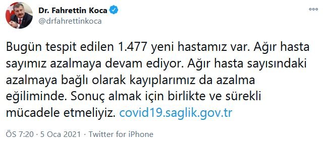 BAKAN KOCA: KAYIPLARIMIZ AZALMA EĞİLİMİNDESosyal medya hesabından güncel verilere ilişkin değerlendirmelerde bulunan Sağlık Bakanı Fahrettin Koca, şu ifadeleri kullandı:* Bugün tespit edilen 1.477 yeni hastamız var. Ağır hasta sayımız azalmaya devam ediyor.* Ağır hasta sayısındaki azalmaya bağlı olarak kayıplarımız da azalma eğiliminde.* Sonuç almak için birlikte ve sürekli mücadele etmeliyiz.