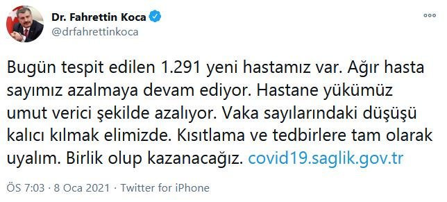 BAKAN KOCA: HASTANE YÜKÜMÜZ AZALIYORSosyal medya hesabından güncel verilere ilişkin değerlendirmelerde bulunan Sağlık Bakanı Fahrettin Koca şu ifadeleri kullandı:* Bugün tespit edilen 1.291 yeni hastamız var. Ağır hasta sayımız azalmaya devam ediyor. Hastane yükümüz umut verici şekilde azalıyor.* Vaka sayılarındaki düşüşü kalıcı kılmak elimizde. Kısıtlama ve tedbirlere tam olarak uyalım. Birlik olup kazanacağız.