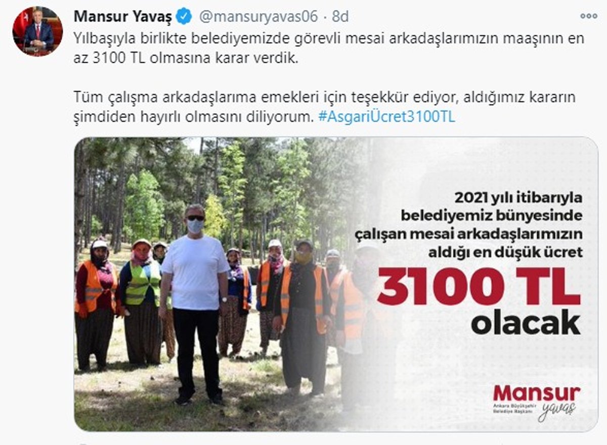 Ankara Büyükşehir Belediye Başkanı Mansur Yavaş, belediye çalışanlarına ödenecek en düşük ücreti açıkladı. Sosyal medya hesabından açıklamada bulunan Yavaş şu ifadeleri kullandı;“Yılbaşıyla birlikte belediyemizde görevli mesai arkadaşlarımızın maaşının en az 3100 TL olmasına karar verdik. Tüm çalışma arkadaşlarıma emekleri için teşekkür ediyor, aldığımız kararın şimdiden hayırlı olmasını diliyorum”