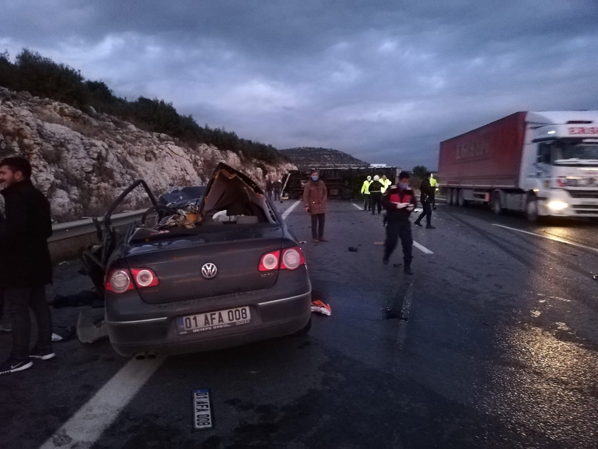 Feci kaza TEM otoyolu Ankara-Tarsus istikameti Karakütük mevkiinde akşam saatlerinde yaşandı.Pozantı istikametine gitmekte olan Ş.S yönetimindeki 06 AB 1448 plakalı kamyon, henüz bilinmeyen bir nedenle direksiyon hakimiyetini kaybederek karşı şeride geçip Tarsus istikametine gitmekte olan G.R yönetimindeki 01 AFA 008 plakalı otomobile çarptı. Çarpmanın etkisiyle otomobil hurdaya dönerken, kamyon ise devrildi.
