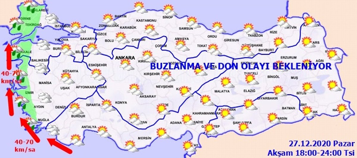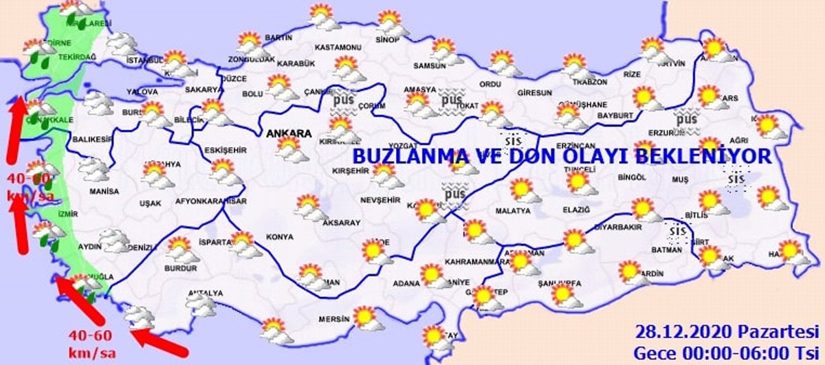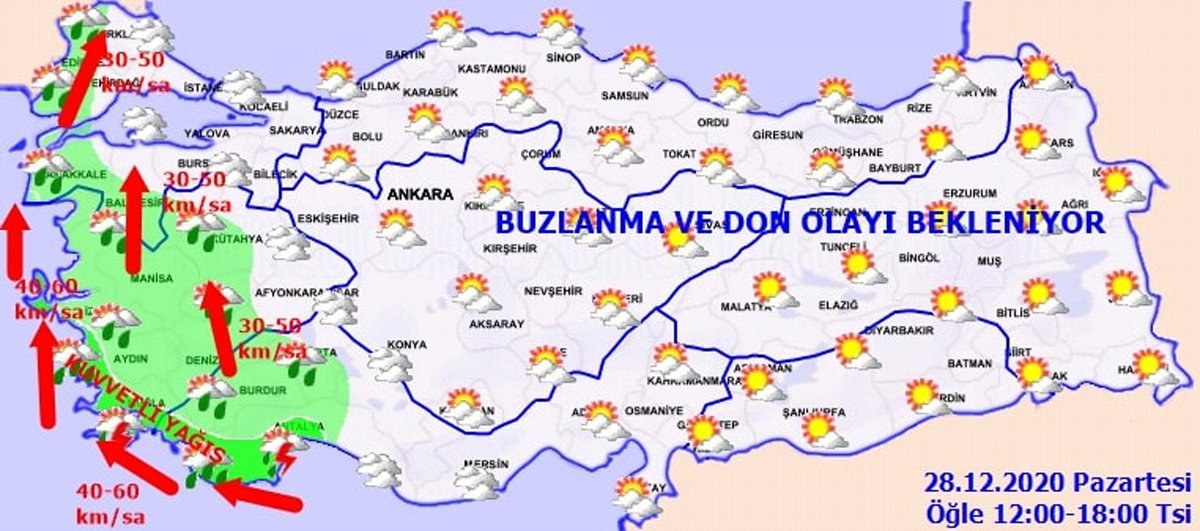 Sabah ve gece saatlerinde bölgenin iç kesimlerinde pus ve yer yer sis hadisesi bekleniyor. Yağışların; Kıyı Ege’de kuvvetli (21-50 kg/m2), Muğla’nın kıyı kesimlerinde yer yer çok kuvvetli (51-75 kg/m2) olması bekleniyor.Rüzgarın; bölgenin iç kesimlerinde kuvvetli (30-50 km/sa), kıyı kesimlerinde bu akşam saatlerinde yer yer kısa süreli fırtına (40-70km/sa) olarak eseceği tahmin ediliyor. İzmir’de yarın il genelinde yerel kuvvetli olması bekleniyor.