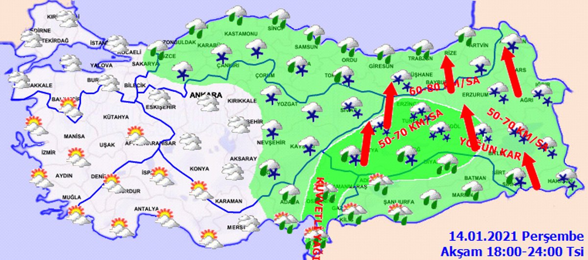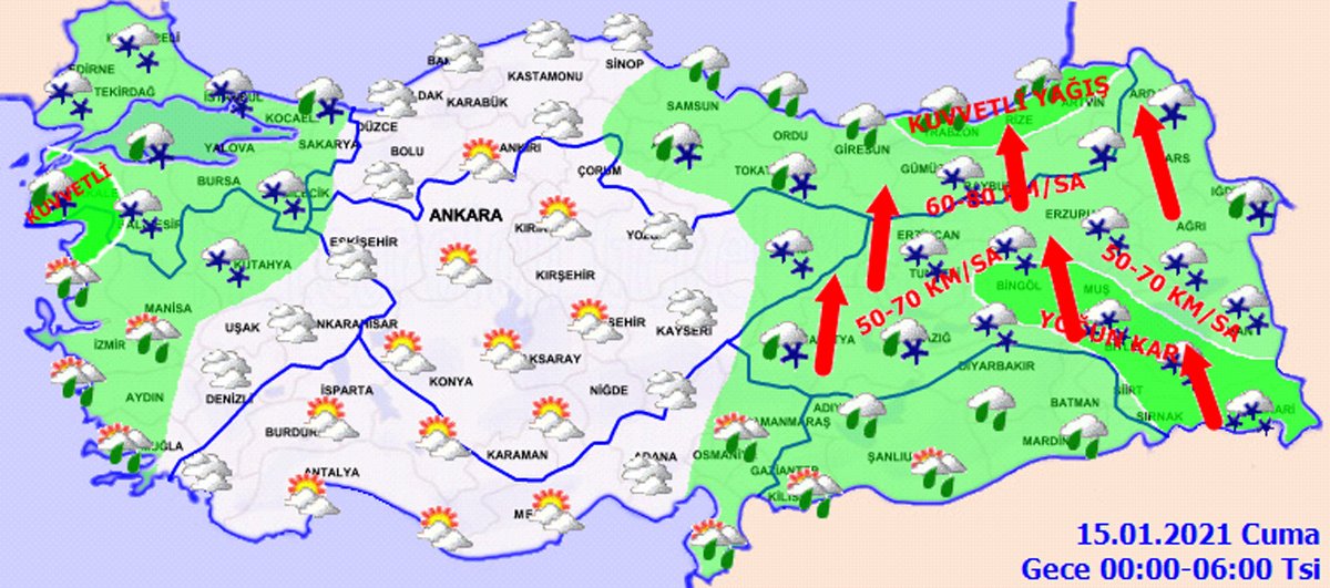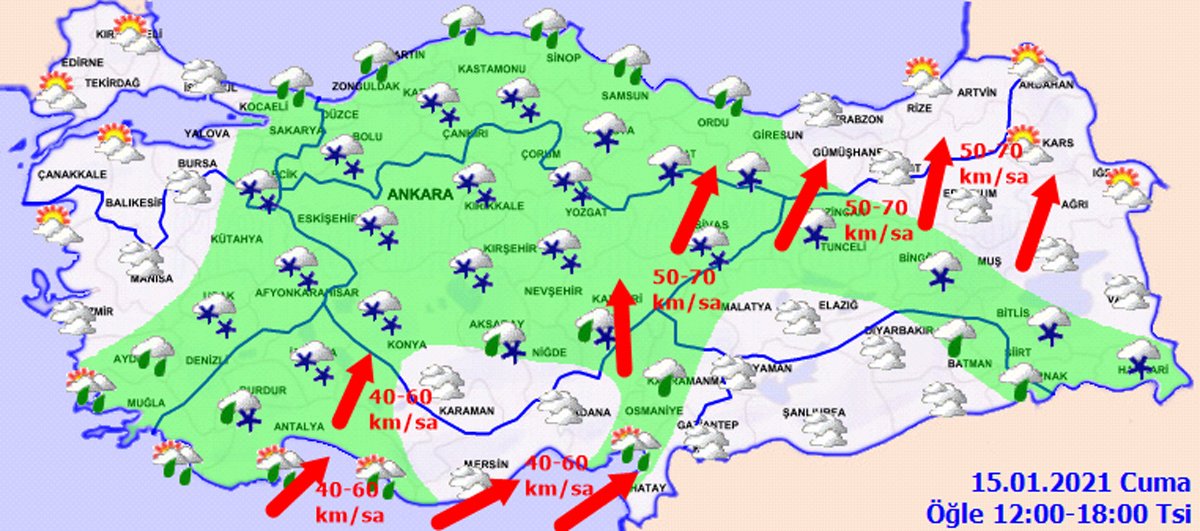 “KUVVETLİ RÜZGAR VE YER YER FIRTINA BEKLENİYOR”Türkiye genelinde sıcaklıkların hissedilir derecede düşeceğini belirten MGM, “Genellikle güney, kuzeybatı kesimlerde kuzey yönlerden hafif, ara sıra orta kuvvette, Marmara’nın kuzey ve batısı, Kıyı Ege, Akdeniz, İç Anadolu’nun güney ve doğusu, Doğu Anadolu ile Doğu Karadeniz'in iç kesimlerinde güneyli yönlerden kuvvetli ve yer yer fırtına (40-70 km/sa) şekline esmesi bekleniyor” açıklamasında bulundu.