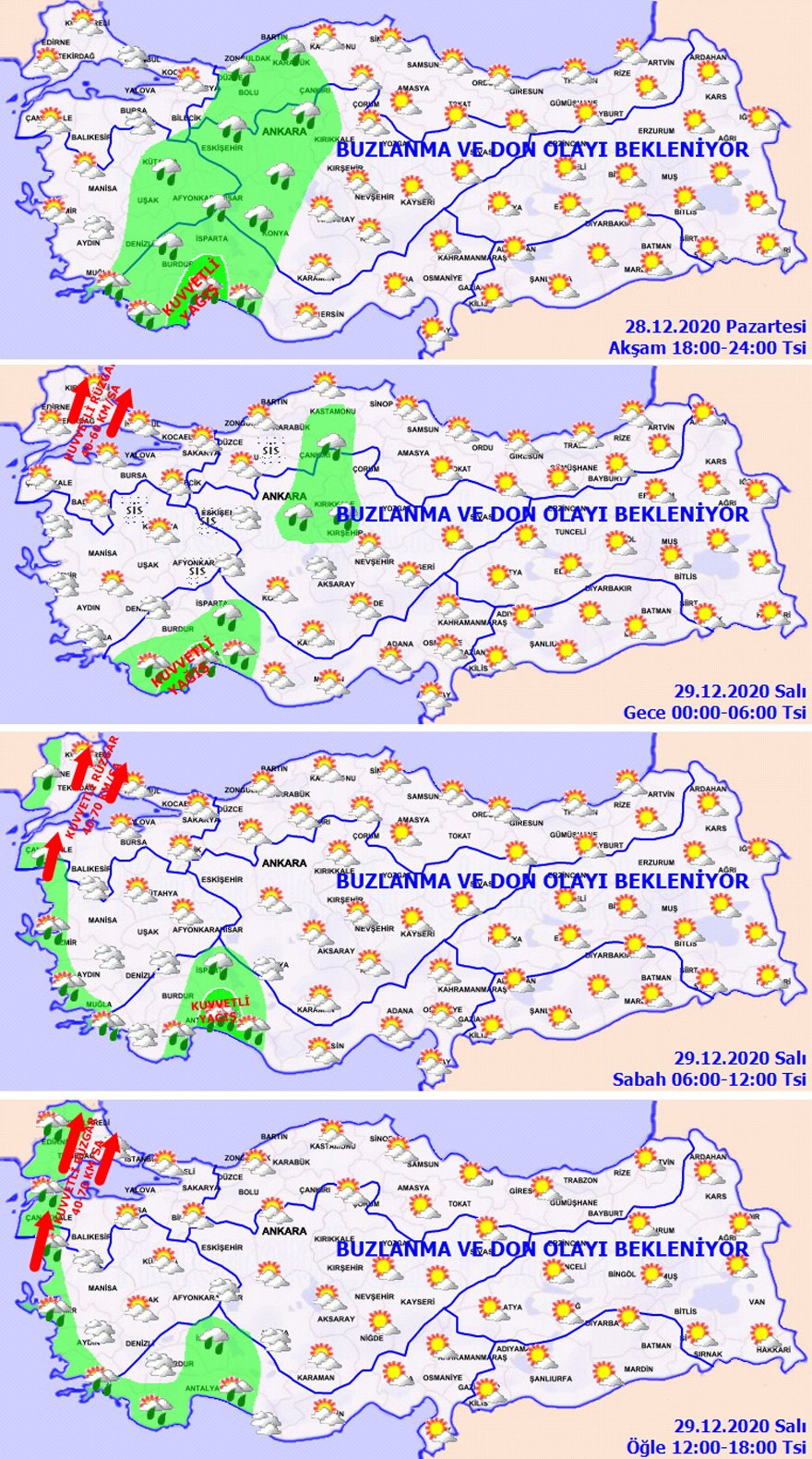 Meteoroloji Genel Müdürlüğü tarafından yapılan Son değerlendirmelere göre ülkemizin iç ve batı kesimlerinin parçalı ve çok bulutlu, Marmara’nın batısı, Kıyı Ege, Batı Akdeniz ve İç Anadolu’nun kuzeybatısı, Batı Karadeniz’in iç kesimleri ile Kütahya, Uşak, Afyonkarahisar, Denizli, Konya, Kırşehir, Düzce, Zonguldak ve Bartın çevrelerinin yağmur ve sağanak, yer yer gök gürültülü sağanak yağışlı, diğer yerlerin az bulutlu ve açık geçeceği tahmin ediliyor.Hava sıcaklıklarında önemli bir değişiklik olmayacağı, ülkemiz genelinde mevsim normallerinin üzerinde seyredeceği tahmin edilirken rüzgarın genellikle güney ve güneybatı, yarın Güneydoğu Anadolu’da kuzeyli yönlerden hafif, ara sıra orta kuvvette, Marmara’nın batısı ile Kuzey Ege kıyılarında kuvvetli ve kısa süreli fırtına şeklinde esmesi bekleniyor.YER YER ÇOK KUVVETLİ OLACAKYağışların; Antalya merkez ve batı ilçelerinde kuvvetli ve yer yer çok kuvvetli (30-80 kg/m2) olması bekleniyor. Meteoroloji’nin açıklamasında vatandaşlara ani sel, su baskını, yıldırım, yağış anında kuvvetli rüzgar ve hortum oluşma riski gibi olumsuzluklara karşı dikkatli ve tedbirli olunması çağrısı yapıldı.Gece ve sabah saatlerinde iç ve doğu kesimlerde yer yer buzlanma ve don olayı, İç Ege, Batı Karadeniz’in iç kesimleri ile İç Anadolu’nun kuzeybatısında yer yer sis ve pus olayı bekleniyor.İKİ İLDE SARI ALARMMeteoroloji’nin MeteoUyarı sistemine göre, yarın için Muğla ve Antalya’ya sarı uyarı verildi. Uyarıda gök gürültülü sağanak yağışın etkili olacağı belirtildi.Öte yandan Meteoroloji tarafından sarı uyarı için yapılan açıklamada “Hava durumu potansiyel tehlikelidir: Tahmin edilen meteorolojik hadise olağandışı olmamakla birlikte, meteorolojik şartlardan etkilenebilecek faaliyetler konusunda dikkatli olunmalıdır” denilmişti.