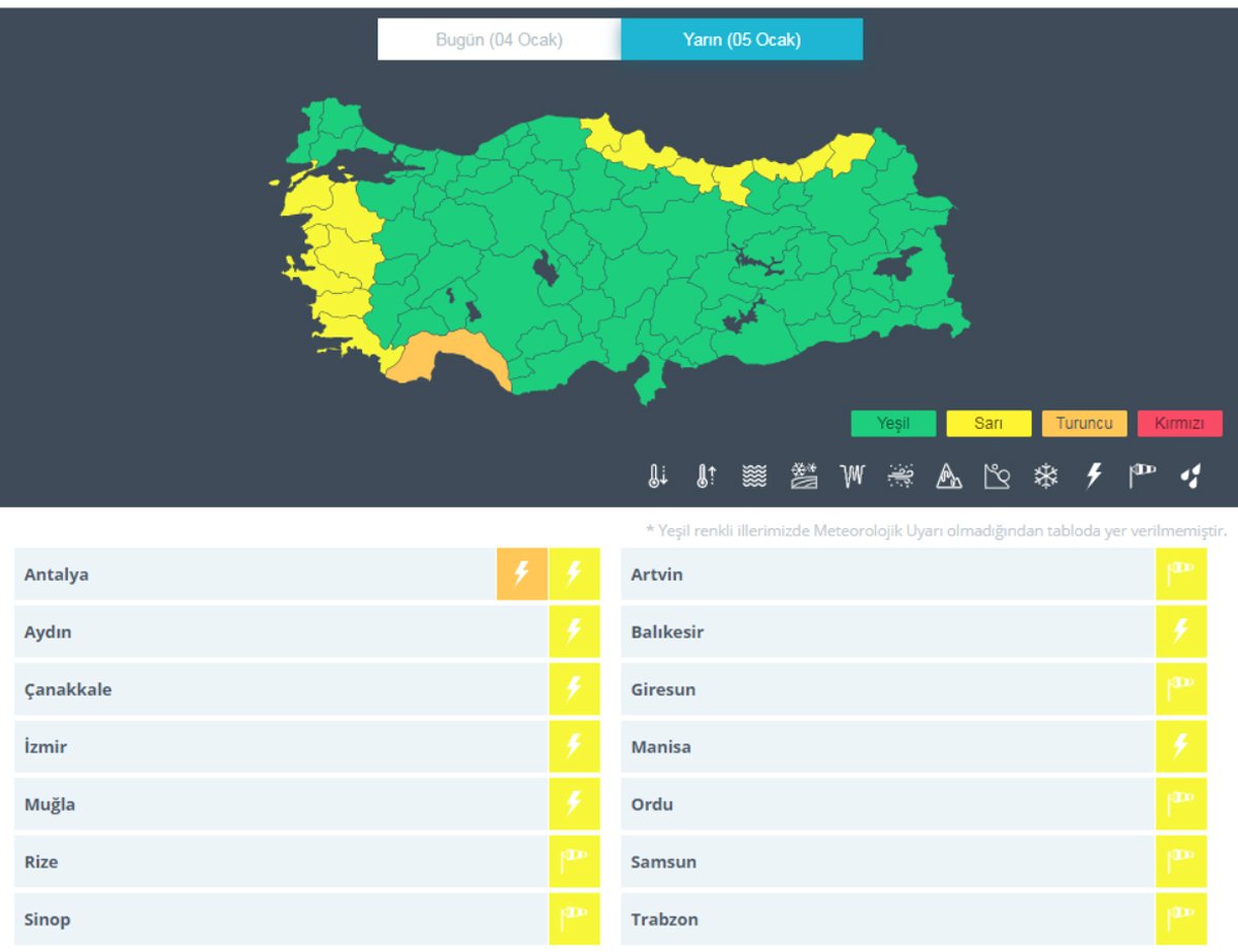 Meteoroloji Genel Müdürlüğü tarafından yapılan Son değerlendirmelere yağışların gece saatlerinde Kıyı Ege’de, yarın Batı Akdeniz ile Muğla ve Aydın çevrelerinde yerel olarak kuvvetli (yer yer 51-100 kg/m2) olması beklendiğinden oluşabilecek ulaşımda aksamalar, su baskını, yıldırım ve benzeri olumsuzluklara karşı tedbirli ve dikkatli olunması uyarısı yapıldı.İSTANBUL’DA YARIN SABAH SAĞANAK VARMarmara Bölgesi’nin yarın parçalı ve çok bulutlu, bu akşam batısının, gece bölge genelinin, yarın (Salı) sabah saatlerinde doğusunun yağmur ve sağanak yağışlı geçeceği tahmin ediliyor.Yağışların gece saatlerinden Çanakkale ve Balıkesir’in batı kesiminde yerel olarak kuvvetli (21-50 kg/m2) olması bekleniyor. Gece saatlerinde bölgenin doğusunda yer yer pus ve sis hadisesi görüleceği tahmin ediliyor.Rüzgarın bölgenin batısında güneyli yönlerden yer yer kuvvetli ve kısa süreli fırtına şeklinde (40-70 km/sa) esmesi bekleniyor. Edirne için akşam ve gece saatlerinde, İstanbul, Kırklareli ve Kocaeli için yarın sabah saatlerinde yağmur ve sağanak yağış bekleniyor.ANKARA VE ÇEVRESİNDE SAĞANAK ÖĞLE SAATLERİNDE ETKİSİNİ GÖSTERECEKİç Anadolu’da havanın az bulutlu, zamanla parçalı ve çok bulutlu, bu gece saatlerinde bölgenin kuzeydoğusunda hafif buzlanma ve don olayı ile birlikte bölge genelinde yer yer pus ve sis hadisesi bekleniyor. Bölgede Ankara, Çankırı, Eskişehir, Konya, Aksaray, Nevşehir, Niğde, Kırşehir ve Kırıkkale için yarın (Salı) öğle saatlerinden sonra yağmur ve sağanak yağış beklendiği duyuruldu.KISA SÜRELİ FIRTINA UYARISIRüzgarın Marmara’nın batısı, Kıyı Ege ve Doğu Karadeniz’in iç kesimlerinde güney yönlerden yer yer kuvvetli ve kısa süreli fırtına şeklinde (40-70 km/sa) esmesi beklendiğinden, oluşabilecek olumsuzluklara karşı tedbirli ve dikkatli olunması gerektiği belirtildi.1 İLDE TURUNCU, 13 İLDE SARI ALARMMeteoroloji’nin MeteoUyarı sistemine göre yarın için 14 ilde alarm verildi. Turuncu alarmın Antalya’da, sarı alarmın ise Artvin, Aydın, Balıkesir, Çanakkale, Giresun, İzmir, Manisa, Muğla, Ordu, Rize, Samsun, Sinop ve Trabzon’da verildiği açıklandı.TURUNCU VE SARI ALARM NEDİR?Meteoroloji tarafından turuncu alarm için “Hava durumu tehlikelidir: Tahmin edilen meteorolojik hadise sıklıkla görülmemektedir. Hasar ve kayıpların oluşması muhtemeldir. Çok tedbirli olmalı, güncel meteorolojik koşullar ve tahminler takip edilmelidir”, sarı alarm için de “Hava durumu potansiyel tehlikelidir: Tahmin edilen meteorolojik hadise olağandışı olmamakla birlikte, meteorolojik şartlardan etkilenebilecek faaliyetler konusunda dikkatli olunmalıdır” açıklaması yapılmıştı.