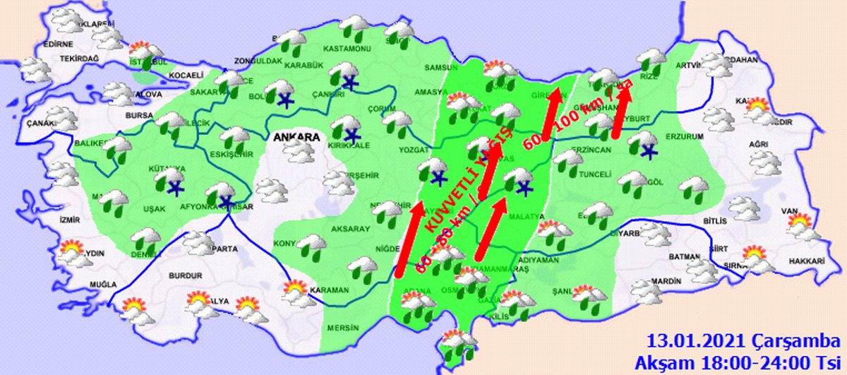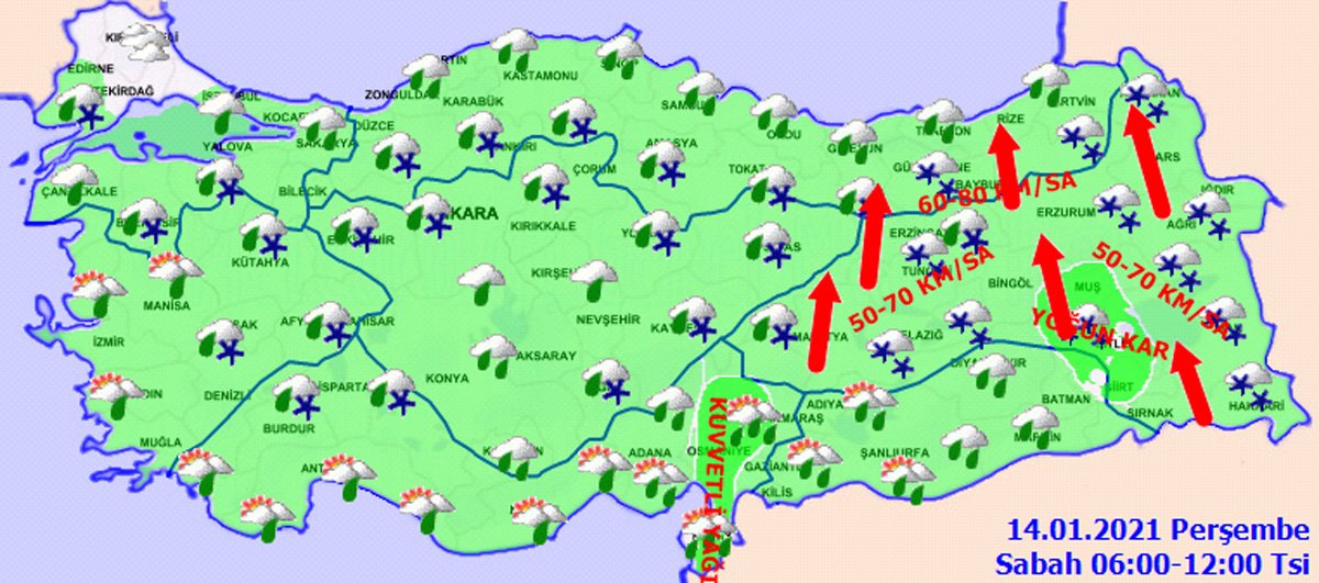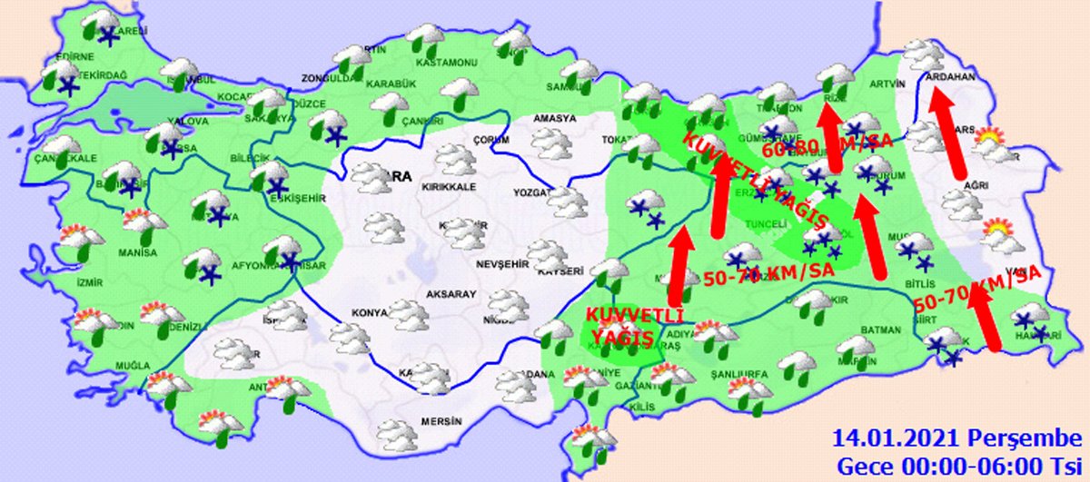 İç Anadolu’da çok bulutlu, bölge genelinin karla karışık yağmur ve kar yağışlı geçeceği tahmin ediliyor. Yağışların bu akşam saatlerinde Kayseri ve Sivas çevrelerinde yerel olarak kuvvetli olması bekleniyor. Rüzgarın doğusunda güneyli yönlerden kuvvetli ve fırtına (50-80 km/sa) şeklinde esmesi bekleniyor. Ankara’da yarın sabah saatlerinden itibaren karla karışık yağmur ve kar yağışı görülecek. Eskişehir, Konya, Niğde’de aralıklı kar yağışları görülmesi bekleniyor.Batı Karadeniz’in çok bulutlu, kıyılarının yağmur, iç kesimlerinin karla karışık yağmur ve kar yağışlı geçeceği tahmin ediliyor. Özellikle Bolu ve Kastamonu çevresinde kar yağışı bekleniyor.Doğu Anadolu’da çok bulutlu karla karışık yağmur ve kar yağışlı geçeceği tahmin ediliyor. Yağışların güney ve batı kesimlerinde yerel olarak kuvvetli olması bekleniyor. Rüzgarın güney yönlerden kuvvetli rüzgar ve fırtına (50-80 km/sa) şeklinde esmesi bekleniyor. Doğusunda buzlanma ve don olayı bekleniyor. Erzurum ve Malatya’da kar yağışı bu akşam saatlerinden itibaren beklenirlen, Kars ve Van’da yarın sabah saatlerinden itibaren görülecek.Güneydoğu Anadolu’da bölge genelinin yağmur ve sağanak yağışlı geçeceği tahmin ediliyor. Yağışların Adıyaman, Diyarbakır ve Siirt çevrelerinde yerel olarak kuvvetli olması bekleniyor.İlginizi Çekebilir