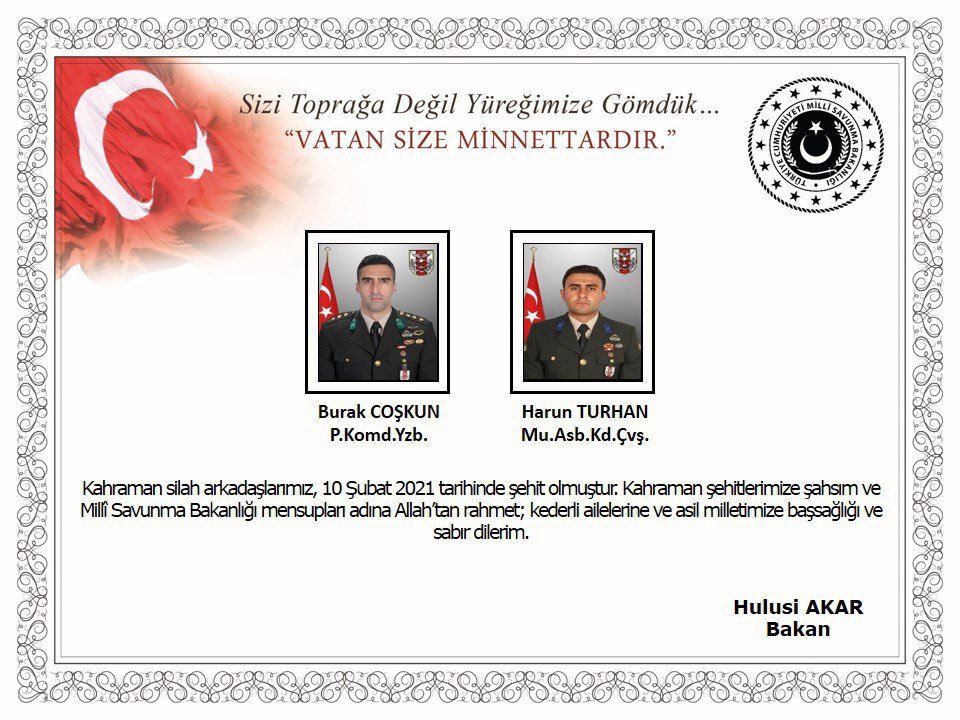 Milli Savunma Bakanlığı P. Komd. Yzb. Burak Coşkun ile Mu. Asb. Kd. Çvş. Harun Turhan’ın şehit olduğunu duyurdu. Bakanlık tarafından yapılan yazılı açıklama şöyle denildi:* Gara Bölgesinde devam eden Pençe Kartal-2 Harekatında 2 asker şehit oldu, 4 askere yaralandı.Milli Savunma Bakanı Hulusi Akar ise yaptığı açıklamada şu ifadeleri kullandı:* Kahraman silah arkadaşlarımız, 10 Şubat 2021 tarihinde şehit olmuştur. Kahraman şehitlerimize şahsım ve Milli Savunma Bakanlığı mensupları adına Allah’tan rahmet; kederli ailelerine ve asil milletimize başsağlığı ve sabır dilerim.