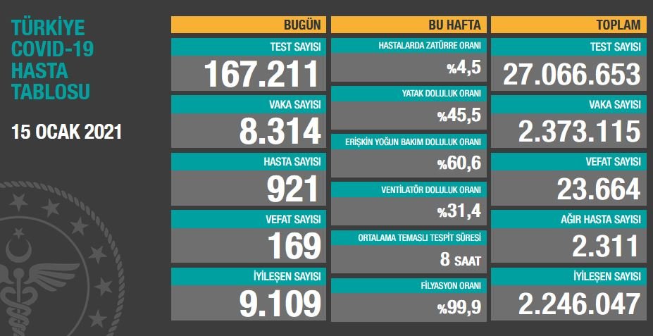 Sağlık Bakanı Fahrettin Koca, corona virüsü salgını nedeniyle yaşanan yeni can kaybını, vaka ve hasta sayısını açıkladı.Tabloya göre Son 24 saatte 169 kişi corona virüsünden hayatını kaybetti, toplam can kaybı 23 bin 664’e yükseldi.Bugün toplam 167 bin 211 test yapıldı. Semptom gösteren 921 kişiyle birlikte toplam 8 bin 314 yeni vaka tespit edildi. Türkiye’de toplam vaka sayısı 2 milyon 373 bin 115 oldu.Bugün iyileşen 9 bin 109 kişiyle birlikte toplam iyileşen hasta sayısı 2 milyon 246 bin 47’ye yükseldi. Toplam hastalarda zatürre oranının yüzde 4.5, toplam ağır hasta sayısının ise 2 bin 311 olduğu açıklandı.Türkiye genelinde yatak doluluk oranı yüzde 45.5, erişkin yoğun bakım doluluk oranı yüzde 60.6 ve ventilatör doluluk oranı yüzde 31.4 olarak duyuruldu.