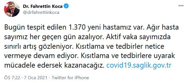 BAKAN KOCA’DAN AÇIKLAMASosyal medya hesabından güncel verilere ilişkin açıklamalarda bulunan Sağlık Bakanı Fahrettin Koca şu ifadeleri kullandı:* Bugün tespit edilen 1.370 yeni hastamız var. Ağır hasta sayımız her geçen gün azalıyor.* Aktif vaka sayımızda sınırlı artış gözleniyor. Kısıtlama ve tedbirler netice vermeye devam ediyor.* Kısıtlama ve tedbirlere uyarak mücadele edersek kazanacağız