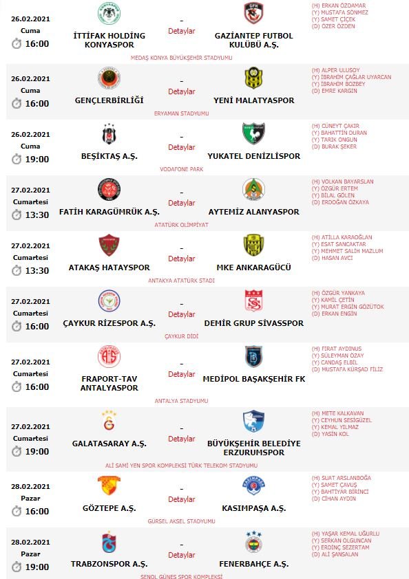 2020-2021 Sezonu Süper Lig 27. hafta karşılaşmaları 26, 27 ve 28 Şubat’ta, TFF 1. Lig 23. hafta karşılaşmaları 23, 24 ve 25 Şubat’ta, 24. hafta karşılaşmaları 27, 28 Şubat ve 1 Mart’ta, Misli.com 2. Lig 25. hafta karşılaşmaları 24 Şubat’ta, Misli.com 3. Lig 1. Grup 20. hafta, 2. Grup, 3. Grup ve 4. Grup 23. hafta karşılaşmaları 25 Şubat’ta oynanacak.Karşılaşma programları şöyle: