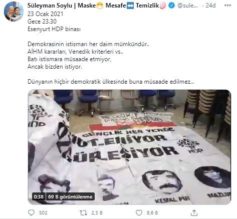 Bakan Soylu, HDP Esenyurt binasının görüntülerinin olduğu paylaşımında şu ifadeleri kullandı: 23 Ocak 2021, gece 23.30, Esenyurt HDP binası. Demokrasinin istismarı her daim mümkündür. AİHM kararları, Venedik kriterleri vs. Batı istismara müsaade etmiyor. Ancak bizden istiyor. Dünyanın hiçbir demokratik ülkesinde buna müsaade edilmez.İlginizi Çekebilir