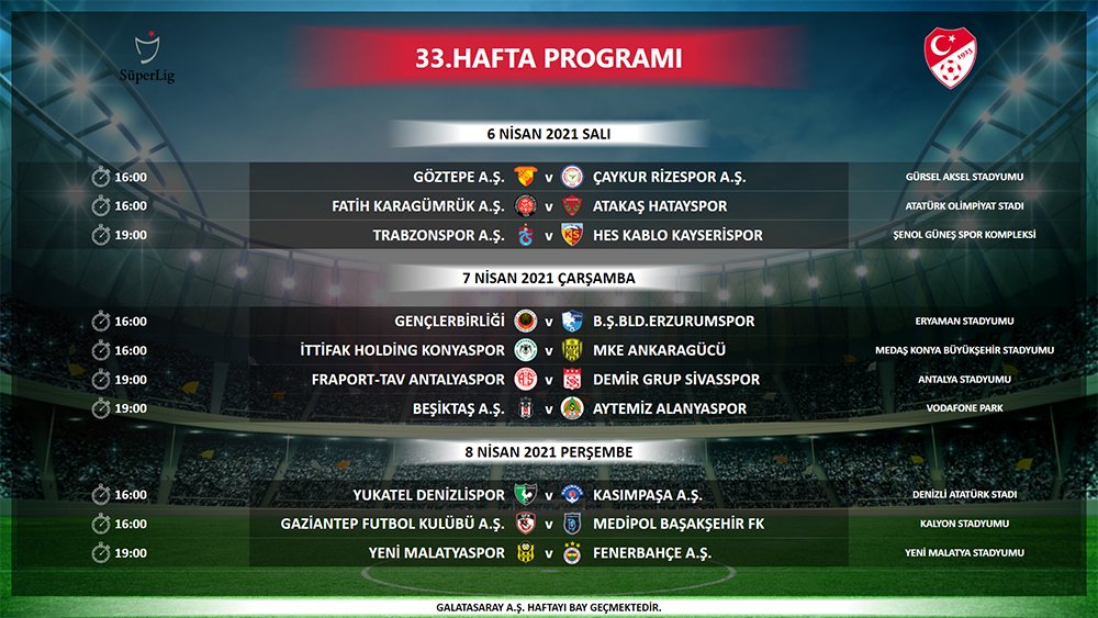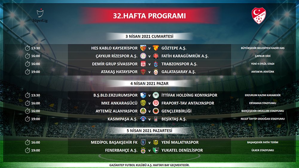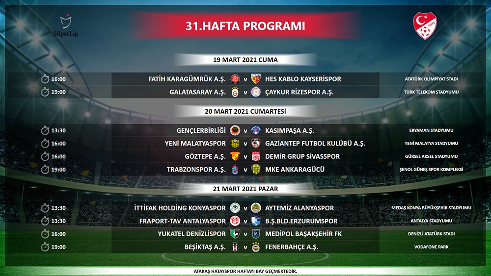 Spor Toto Süper Lig'in 30, 31, 32, 33 ve 34. haftada oynanacak maçların programları açıklandı. Spor Toto Süper Lig’de 30 ve 34. hafta arasında oynanacak maçların programı Türkiye Futbol Federasyonu tarafından açıklandı.Vodafone Park’taki Beşiktaş-Fenerbahçe derbisi 21 Mart Pazar günü saat 19.00’da oynanacak.