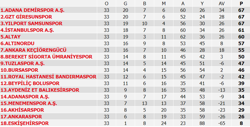 Adanaspor-SamsunsporTuzlaspor-GiresunsporMenemenspor-Adana DemirsporAkhisarspor-ÜmraniyesporAltay-BandırmasporAnkaraspor-İstanbulsporBalıkesirspor-AltınorduBoluspor-EskişehirsporBursaspor-Keçiörengücü