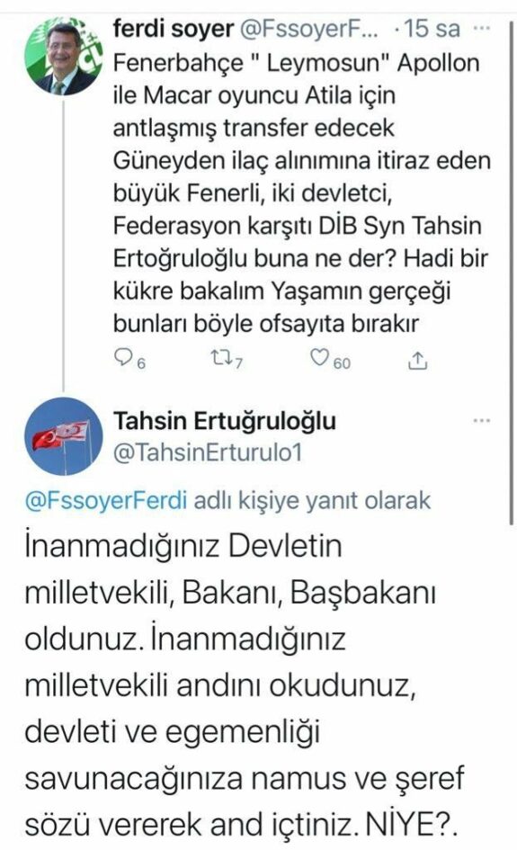 Fenerbahçe’nin Güney Kıbrıs Rum Kesimi ekibi Apollon Limassol'den Attila Szalai’yi transfer etmesi Kuzey Kıbrıs Türk Cumhuriyeti'nde (KKTC) tartışmalara neden oldu. Fenerbahçe'nin Güney Kıbrıs Rum Kesimi takımlarından Apollon Limassol takımında forma giyen Macar savunma oyuncusu Attila Szala’yi transfer etmesi Kuzey Kıbrıs Türk Cumhuriyeti’nde tartışmalara neden oldu. Kuzey Kıbrıs Türk Cumhuriyeti (KKTC) eski Başbakanı Ferdi Sabit Soyer ile Dışişleri Bakanı Tahsin Ertuğruloğlu, sosyal medya üzerinde tartıştı. Ferdi Sabit Soyer, Fenerbahçe'nin transferi ile ilgili, “Fenerbahçe, Apollon’un Macar oyuncusu Attila için anlaşmış, transfer edecek. Güney'den ilaç alınımına itiraz eden büyük Fenerli, iki devletçi, federasyon karşıtı Dışişleri Bakanı Sayın Tahsin Ertuğruloğlu buna ne der. Hadi bir kükre bakalım. Yaşamın gerçeği bunları böyle ofsaytta bırakır” paylaşım yaptı.