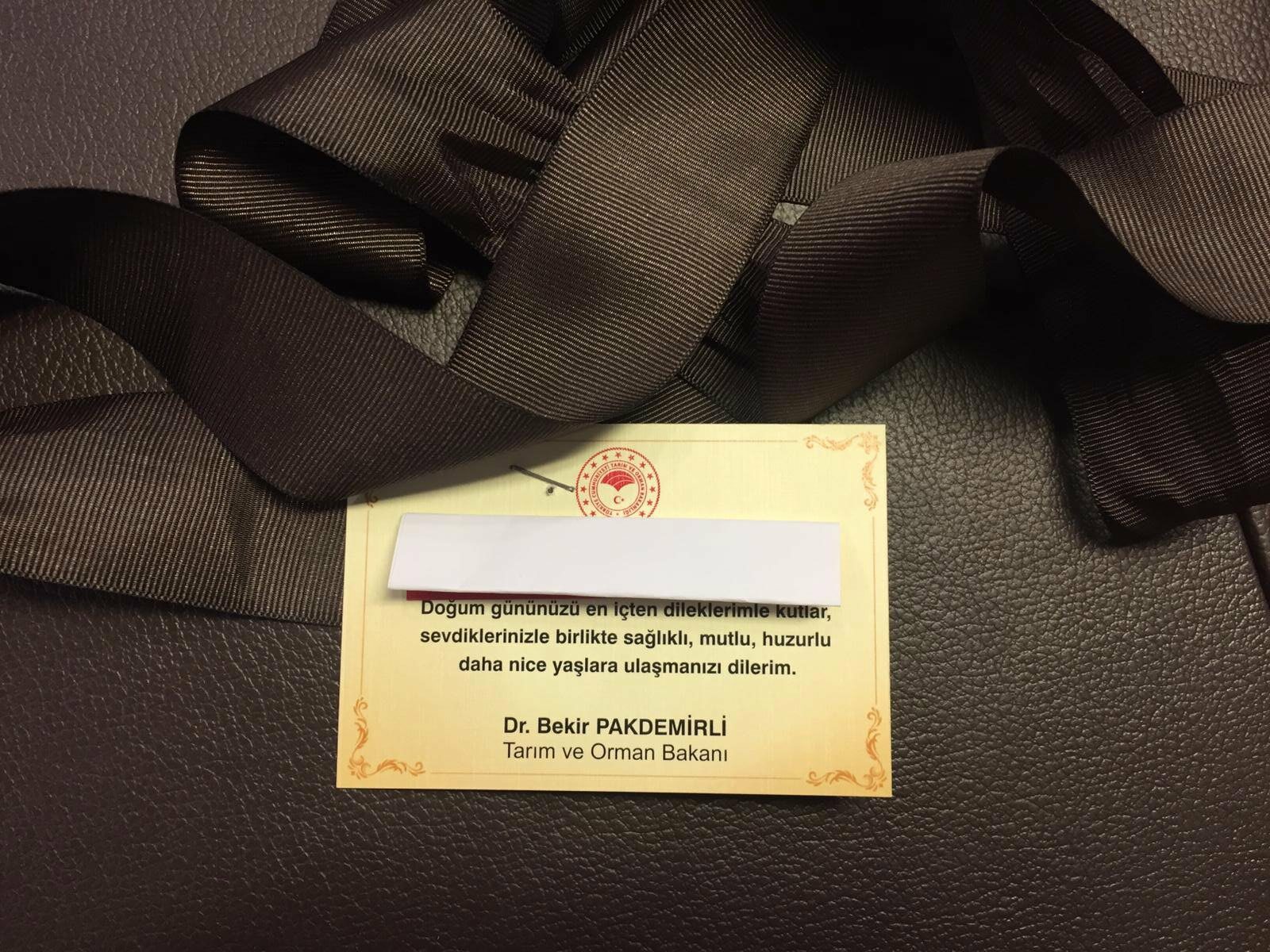 Hediyenin içinde Bakan Pakdemirli'nin notu yer alıyor.