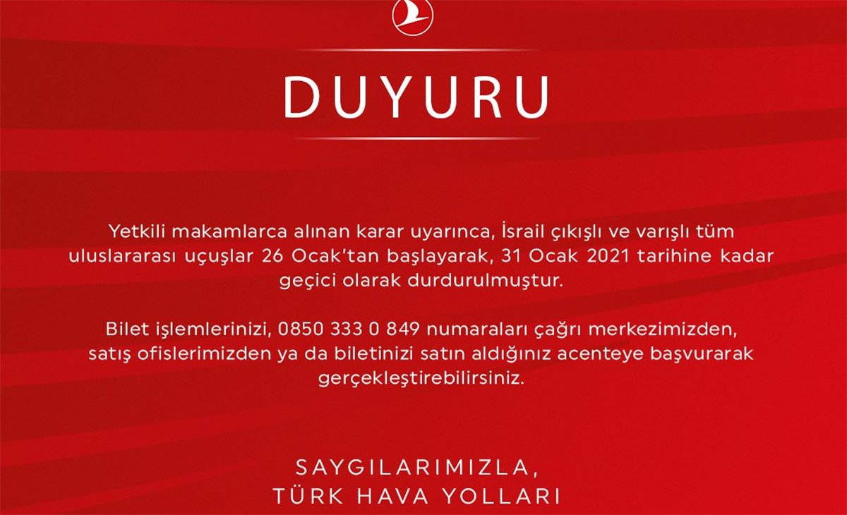 Türk Hava Yolları, yetkili makamlarca alınan karar uyarınca, İsrail çıkışlı ve varışlı tüm uluslararası uçuşların 26 Ocak’tan başlayarak, 31 Ocak 2021 tarihine kadar geçici olarak durdurulduğunu duyurdu.