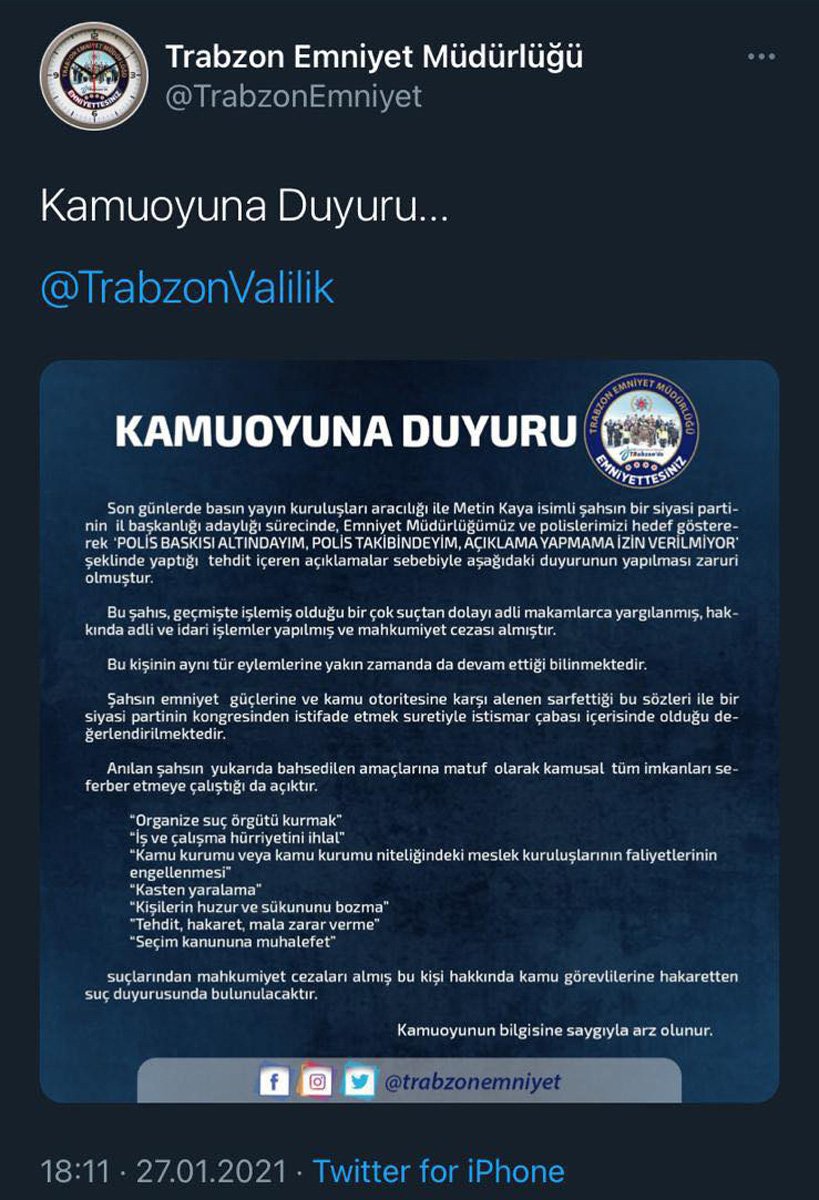 Trabzon Tüm Muhtarlar Derneği Başkanı Metin Kaya, 15 Şubat’ta yapılması planlanan AKP 7. Olağan İl Kongresi’nde aday olmasının engellendiğini ve basın açıklaması yaptırılmadığını iddia etti. Kaya’nın önce otelde yaptığı toplantıyı polisin engellediğini daha sonra da Gazeteciler Cemiyeti’nde yapmak istediği basın açıklamasına valiliğin izin vermediğini ileri sürerek, sokakta adaylığını açıklamıştı. Yaptığı açıklamada da AKP yönetimi ile valiliği eleştiren Kaya’ya cevap Trabzon Emniyet Müdürlüğü’nden geldi.SUÇ KAYDINI AÇIKLADILARTrabzon Emniyet Müdürlüğü sosyal medyadan Trabzon Valiliği’ne ait hesabı da etiketleyerek yaptığı açıklamada, AKP İl Başkanı adayı olan Metin Kaya’nın suç kaydını açıkladı. Emniyetten yapılan açıklamada, “Bu şahıs, geçmişte işlemiş olduğu bir çok suçtan dolayı adli makamlarca yargılanmış, hakkında adli ve idari işlemler yapılmış ve mahkumiyet cezası almıştır. Bu kişinin aynı tür eylemlerine yakın zamanda da devam ettiği bilinmektedir. Şahsın emniyet güçlerine ve kamu otoritesine karşı alenen sarfettiği bu sözleri ile bir siyasi partinin kongresinden istifade etmek suretiyle istismar çabası içerisinde olduğu değerlendirilmektedir. Anılan şahsın yukarıda bahsedilen amaçlarına matuf olarak kamusal tüm imkanları seferber etmeye çalıştığı da açıktır” denildi.