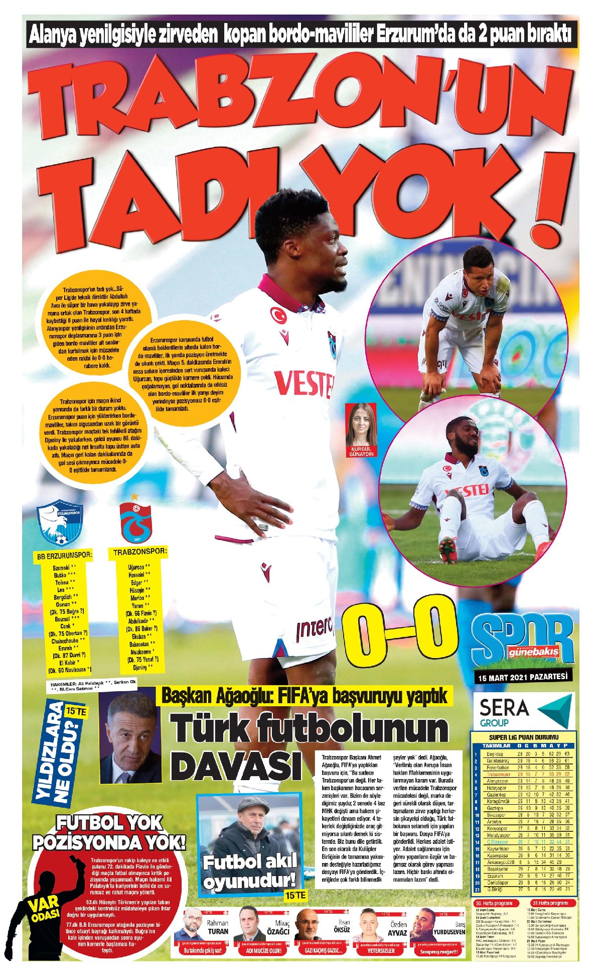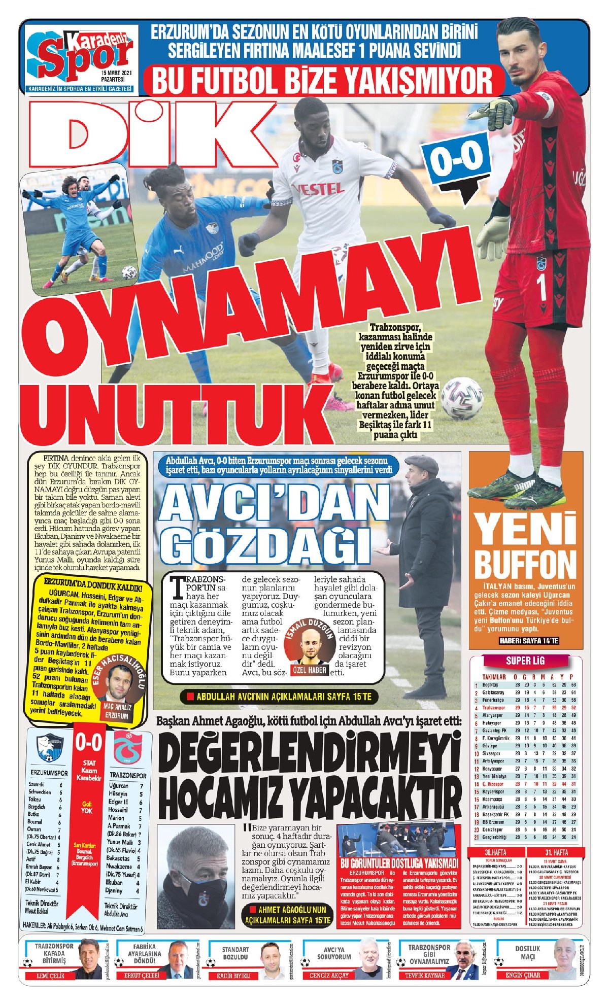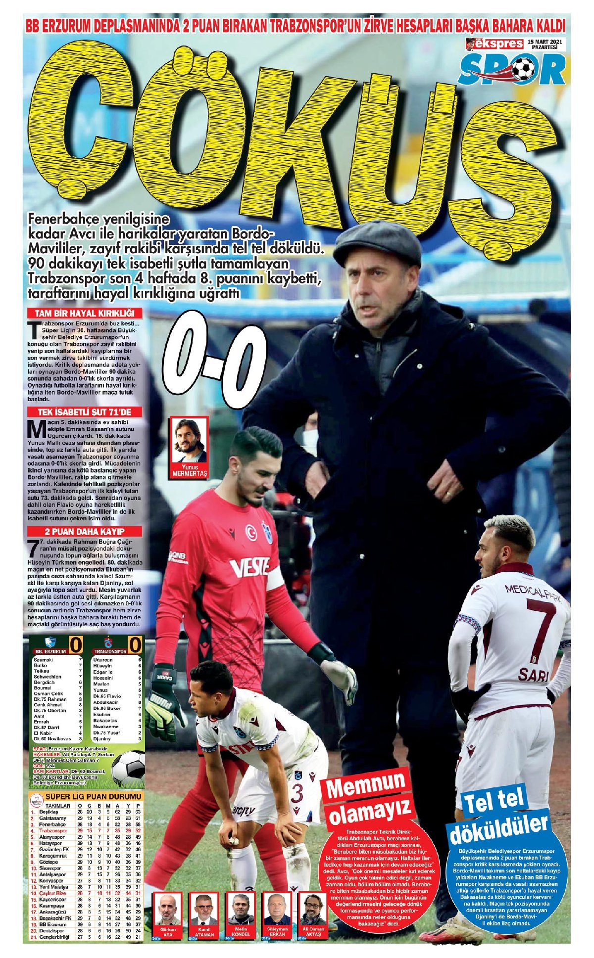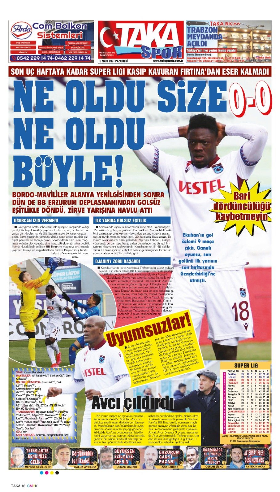 Trabzon'da yerel gazeteler, Trabzonspor'un 1 puanla döndüğü BB Erzurumspor maçının ardından bordo-mavili futbolcuları eleştirip, zirve hayallerinin de suya düştüğüne dikkat çekti. Süper Lig’in 30. haftasında Trabzonspor, deplasmanda konuk olduğu BB Erzurumspor’la 0-0’lık skorla berabere kaldı. Kentte yayınlanan yerel gazeteler sayfalarında, bordo mavili futbolcuların oyununu eleştirdi. Gazeteler ayrıca, Trabzonspor’un vasat futbol ortaya koyduğuna değinip, zirve hayallerinin de suya düştüğüne dikkat çekti.İlginizi Çekebilir