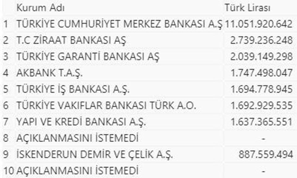 Listenin 8 ve 10'uncu sırasındakiler isminin açıklanmasını istemezken, 9'uncu sırada İskenderun Demir ve Çelik AŞ yer aldı.