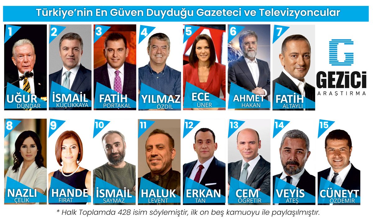 Gezici Araştırma Merkezi, Türkiye genelinde halkın en çok güven duyduğu isimleri belirledi. Uğur Dündar, en güvenilir isimler listesinde yine zirvede yer aldı…