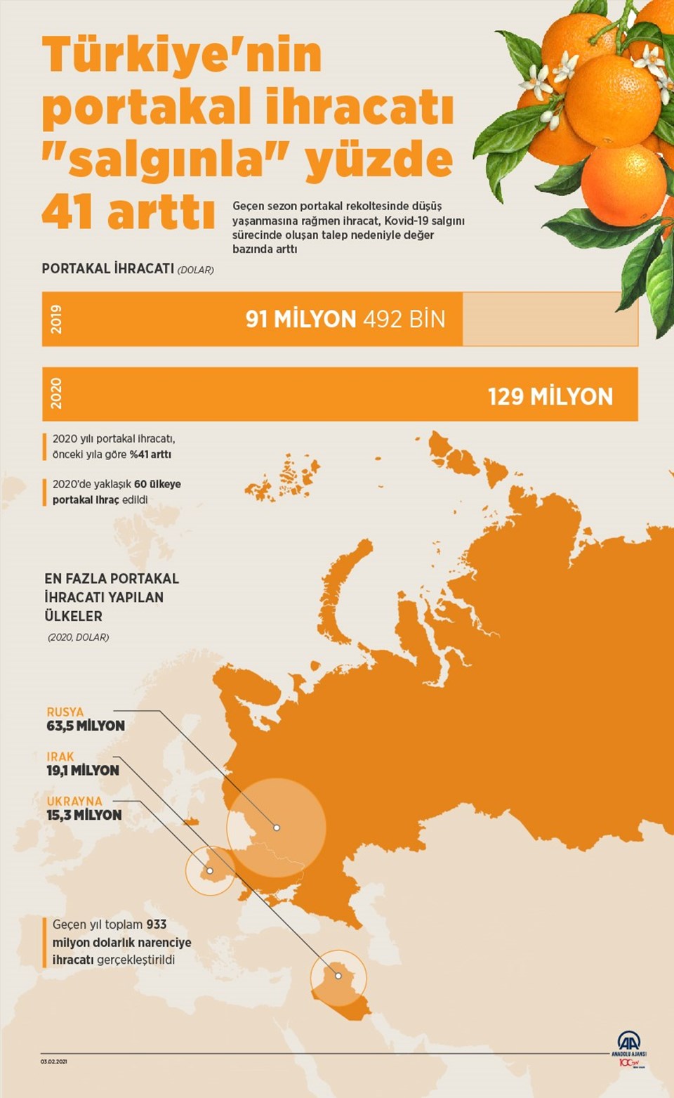 Geçen sene yaklaşık 60 ülkeye portakal gönderilirken rakam 2019'a göre yüzde 41 artarak 129 milyon dolara çıktı. Portakal ihracatında yaş meyve sebzenin geleneksel pazarı Rusya, 63 milyon 482 bin dolarla ilk sırada yer aldı. Bu ülkeyi 19 milyon 111 bin dolarla Irak ve 15 milyon 314 bin dolarla Ukrayna takip etti.Ege Yaş Meyve Sebze İhracatçıları Birliği Başkanı Hayrettin Uçak, portakal ihracatında "yüzde 100 analiz zorunluluğuna" dair haberlerin çıktığını ancak böyle bir durumun olmadığını belirtti.Analiz konusunda herhangi bir problem yaşamadıklarını vurgulayan Uçak, "Avrupa Birliği yüzde 10 civarında bir oran koydu ki bu çok makul, olması gereken bir durum" değerlendirmesinde bulundu.