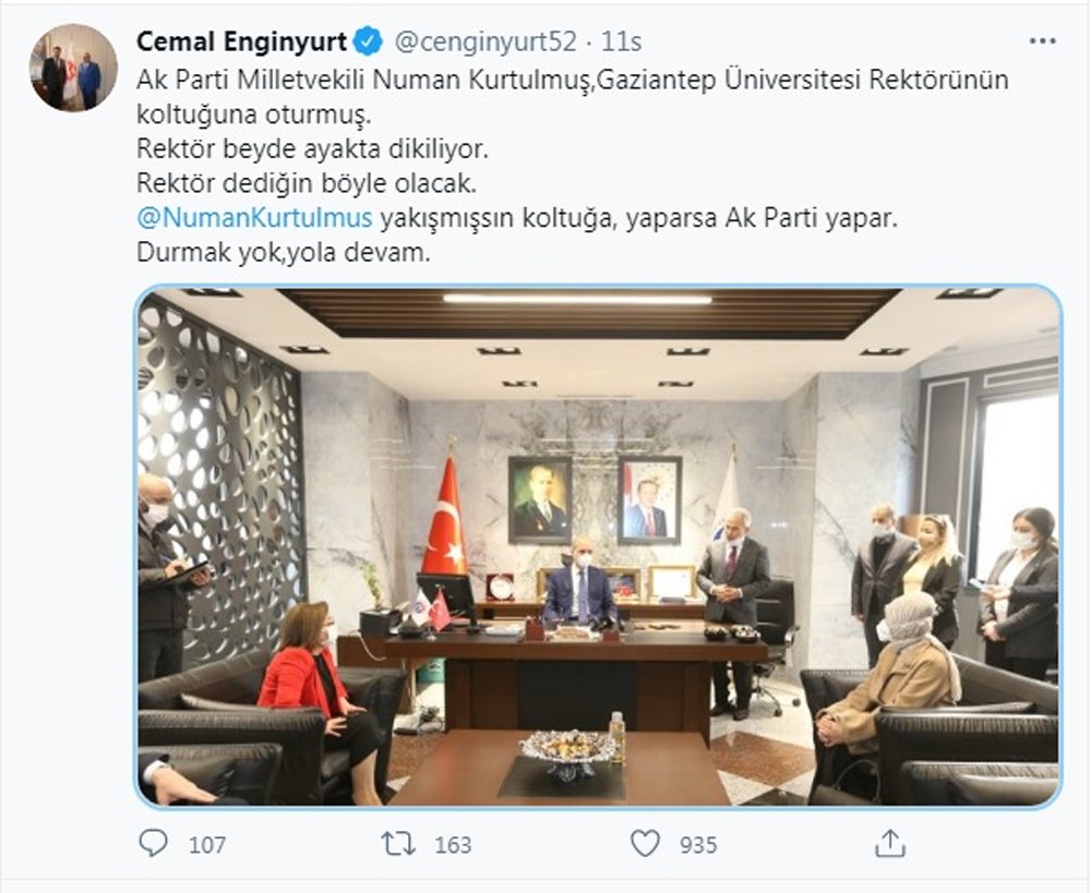 AKP Genel Başkanvekili Numan Kurtulmuş partisinin 7. Olağan Kongresi’ne katılmak üzere gittiği Gaziantep’te çeşitli ziyaretlerde de bulundu. Gaziantep Üniversitesi Rektörü Prof. Dr. Arif Özaydın’ı da ziyaret eden Kurtulmuş’un ziyaret sırasında çekilen bir fotoğraf ise tepki çekti.“REKTÖR DEDİĞİN BÖYLE OLACAK”Fotoğrafta Kurtulmuş’un, rektörün makam koltuğunda, rektör Özaydın’ın da aralarında bulunduğu bazı kişilerin ise ayakta, ellerini önde kenetlemiş şekilde durduğu görülüyor. Fotoğrafı sosyal medya hesabından paylaşan Demokrat Partisi Ordu Milletvekili Cemal Enginyurt,” Ak Parti Milletvekili Numan Kurtulmuş, Gaziantep Üniversitesi Rektörünün koltuğuna oturmuş. Rektör bey de ayakta dikiliyor. Rektör dediğin böyle olacak.@NumanKurtulmus yakışmışsın koltuğa, yaparsa Ak Parti yapar. Durmak yok, yola devam” ifadelerini kullandı.