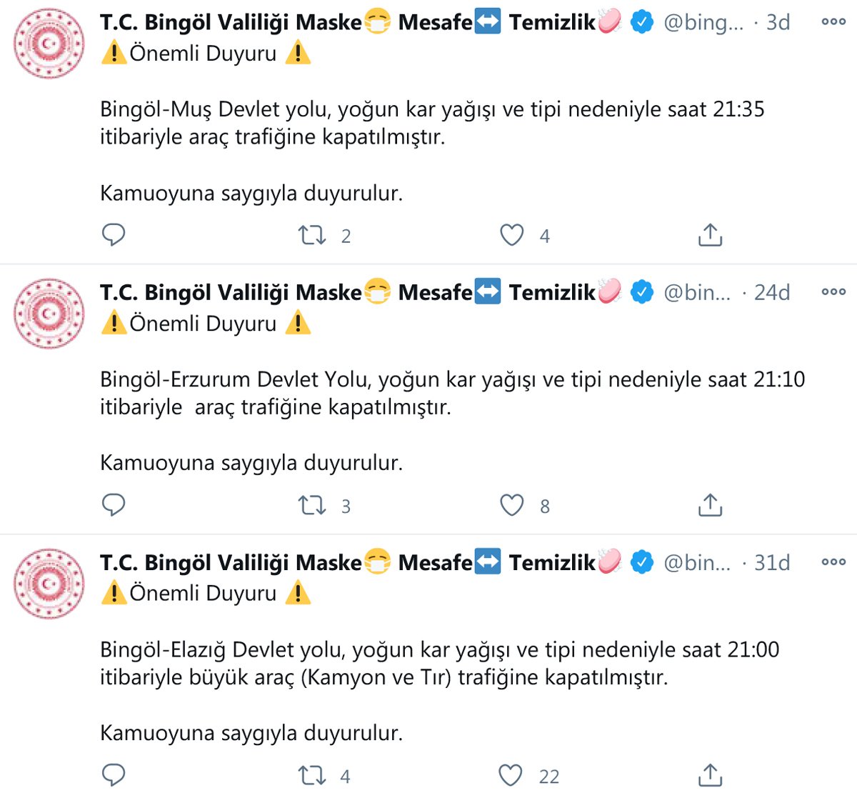 Bingöl Valiliği, sosyal medya hesabından iki yolun yoğun kar yağışı ve tipi nedeniyle araç trafiğine kapatıldığını duyurdu.Valilikten yapılan açıklamada şu ifadelere yer verildi:* Bingöl-Elazığ Devlet yolu, yoğun kar yağışı ve tipi nedeniyle saat 21:00 itibariyle büyük araç (Kamyon ve Tır) trafiğine kapatılmıştır.* Bingöl-Erzurum Devlet Yolu, yoğun kar yağışı ve tipi nedeniyle saat 21:10 itibariyle araç trafiğine kapatılmıştır.* Bingöl-Muş Devlet yolu, yoğun kar yağışı ve tipi nedeniyle saat 21:35 itibariyle araç trafiğine kapatılmıştır.