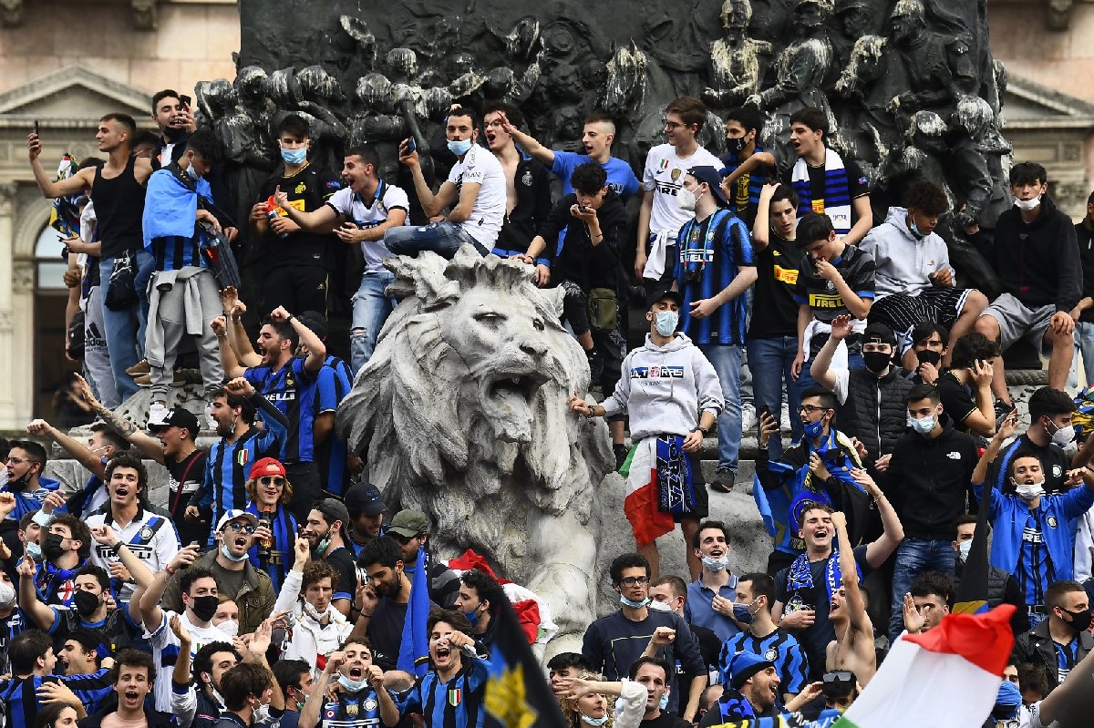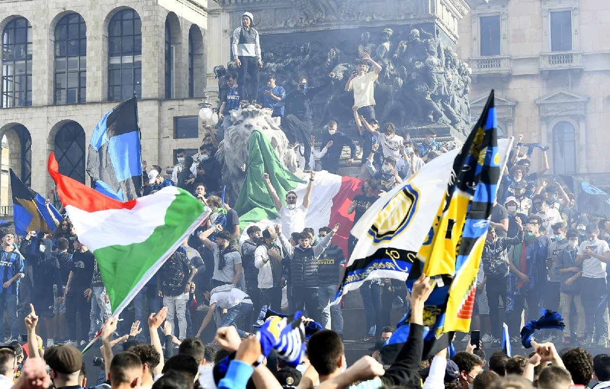 İtalya’da Serie A'nın bitimine 4 hafta kala 82 puanlı Inter’in, şampiyonluğunu ilan etmesi ile binlerce taraftar sokaklara döküldü. Inter taraftarları, maske ve sosyal mesafe kuralını hiçe sayarak şampiyonluk kutlaması yaptı. İtalya'da Serie A’nın bitimine 4 hafta kala 82 puanlı Inter, 19'uncu şampiyonluğunu ilan etti. Juventus’un 9 yıllık ambargosuna son veren Inter'in ardından taraftarlar kutlama için sokaklara döküldü.Milano’nun Duomo Meydanı’nda toplanan binlerce Inter taraftarı, maske ve sosyal mesafe kuralını hiçe sayarak şampiyonluğu kutladı. Taraftarların Covid-19 tedbirlerine uymadığını gören kulüp, resmi sosyal medya hesabı üzerinden uyarı mesajı yayınlayarak, taraftarları sevinçlerini sorumlu bir şekilde göstermeye davet etti.