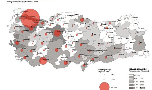 Türkiye İstatistik Kurumu (TÜİK) Uluslararası Göç İstatistikleri verilerine göre, 2021 yılında yurt dışından Samsun'a 15 bin 573 kişi göç ederken, bir önceki yıla göre bu rakam yüzde 218 artış gösterdi.TÜİK verilerine göre, yurt dışından Türkiye'ye göç edenlerin sayısı 2021 yılında, bir önceki yıla göre yüzde 116,9 artarak 739 bin 364 kişi oldu. Göç eden nüfusun yüzde 51,9'unu erkekler, yüzde 48,1'ini ise kadınlar oluşturdu. Yurt dışından gelen nüfusun 124 bin 269'unu Türk vatandaşları, 615 bin 95'ini ise yabancı uyruklular oluşturdu.Yurt dışından Samsun'a 2021 yılında göç edenlerin sayısı bir önceki yıla göre yüzde 218 artış göstererek 15 bin 573 kişi olurken, Samsun'dan yurt dışına 4 bin 226 kişi göç etti. Samsun'a göç edenlerin 13 bin 162'sini yabancı uyruklular oluşturdu.Ordu'ya göç edenlerin sayısı bir önceki yılın rakamlarına göre yüzde 42 artarak 2 bin 241 kişi, Amasya'da yüzde 26 artarak 867 kişi, Sinop'a ise yüzde 58 artarak 588 kişi oldu. 2021 yılında Ordu'ya göç edenlerin bin 83'ünü yabancı uyruklular oluştururken, Amasya'da 511, Sinop'ta ise 332 kişinin yabancı uyruklu olduğu kaydedildi.
